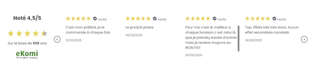 Avec une moyenne supérieure à 4 étoiles sur 5 sur Ekomi, Iron Fist s’impose comme l’une des marques les mieux notées de notre catalogue.