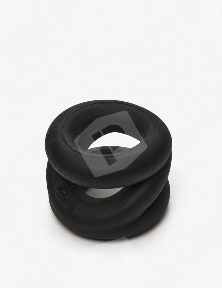 - En mode ballstretcher, enroulez les trois anneaux autour du scrotum pour créer un étirement empilé progressif qui tire les testicules vers le bas. Cette configuration crée une sensation de poids agréable qui intensifie les sensations pendant l'orgasme.