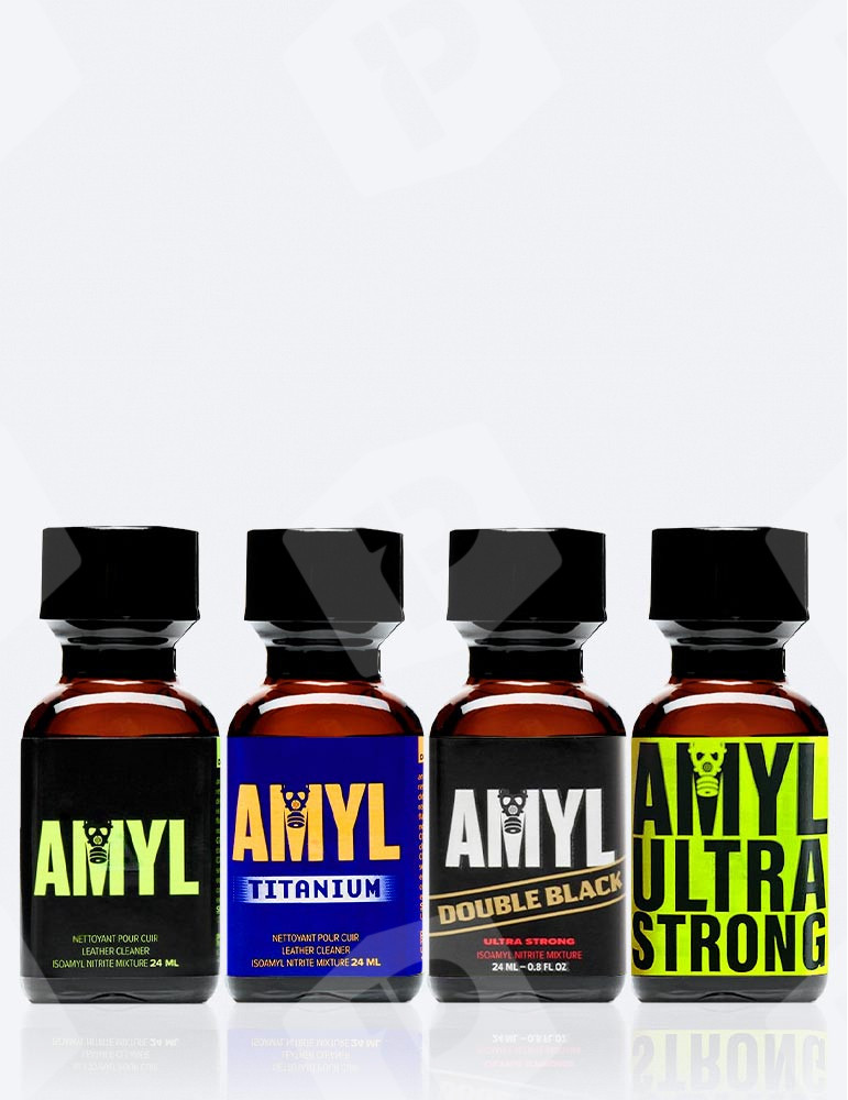 - l'Amyl Ultra Strong 24ml révélant sa formule ultra-puissante au nitrite d'amyle pur pour euphorie et relaxation intense prolongée. Cette collection exhaustive permet d'explorer quatre tempéraments distincts de la marque Amyl en format généreux 24 ml.